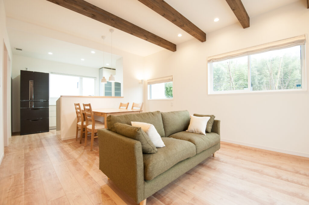 可愛いけれど、次世代型ハイスペック仕様の家 白いクロスや建具を使用したシンプルな空間に、ナチュラル系のフロアーと現しにした梁がバランスよくアクセントとなって素敵なリビングを演出。寝室は、市内を一望できる窓、大画面で映像を楽しめるプロジェクター、天井クロスを張り分けるなど、こだわりの詰まったお部屋となりました。
